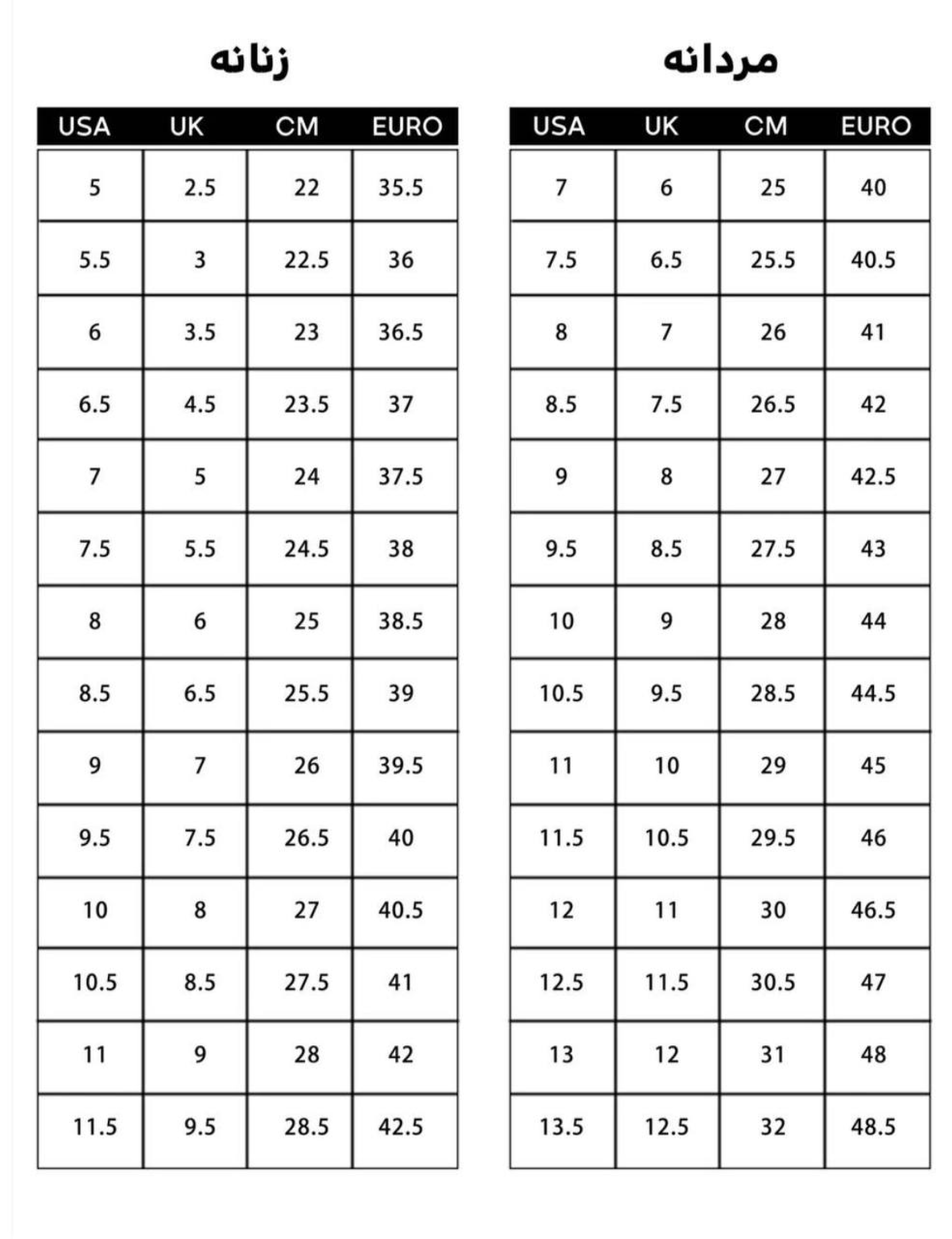 اندازه ها بر حسب سانتی متر می باشد. دقت کنید که سایز رایج و مورد استفاده شما معمولا EURO ( ستون سمت راست ) می باشد.13:47