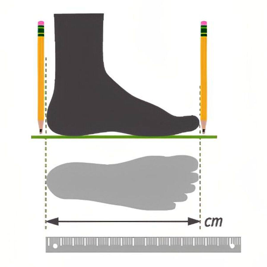 طبق تصویر طول کف پای خود را به سانتی متر ( cm ) اندازه بگیرید و سایز پای خود را در جدول زیر ببینید: